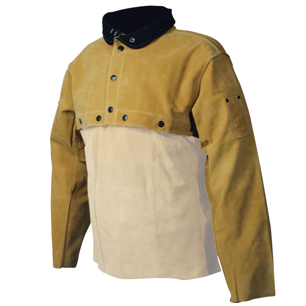 - Stand-up/roll-down leather collar snaps securely in place to protect neck.