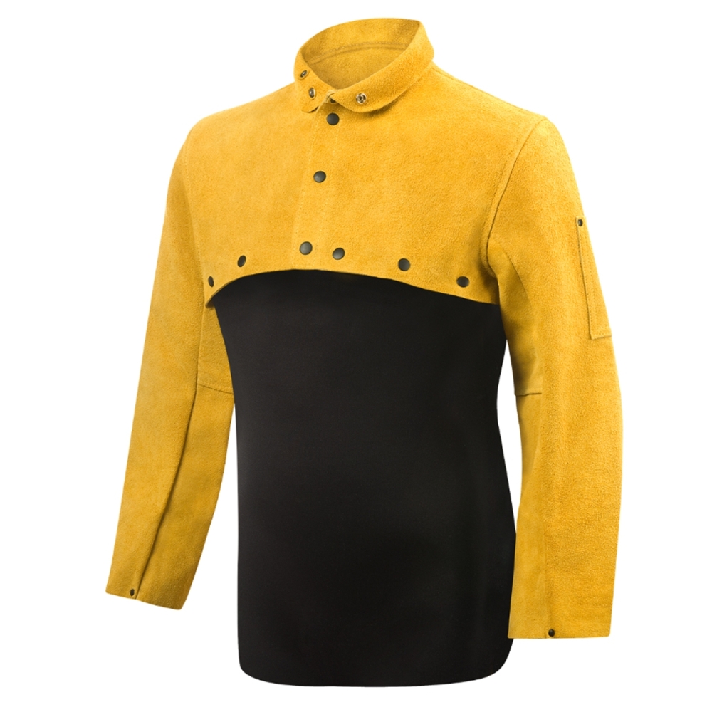 - Stand-up/roll-down leather collar snaps securely in place to protect neck.
