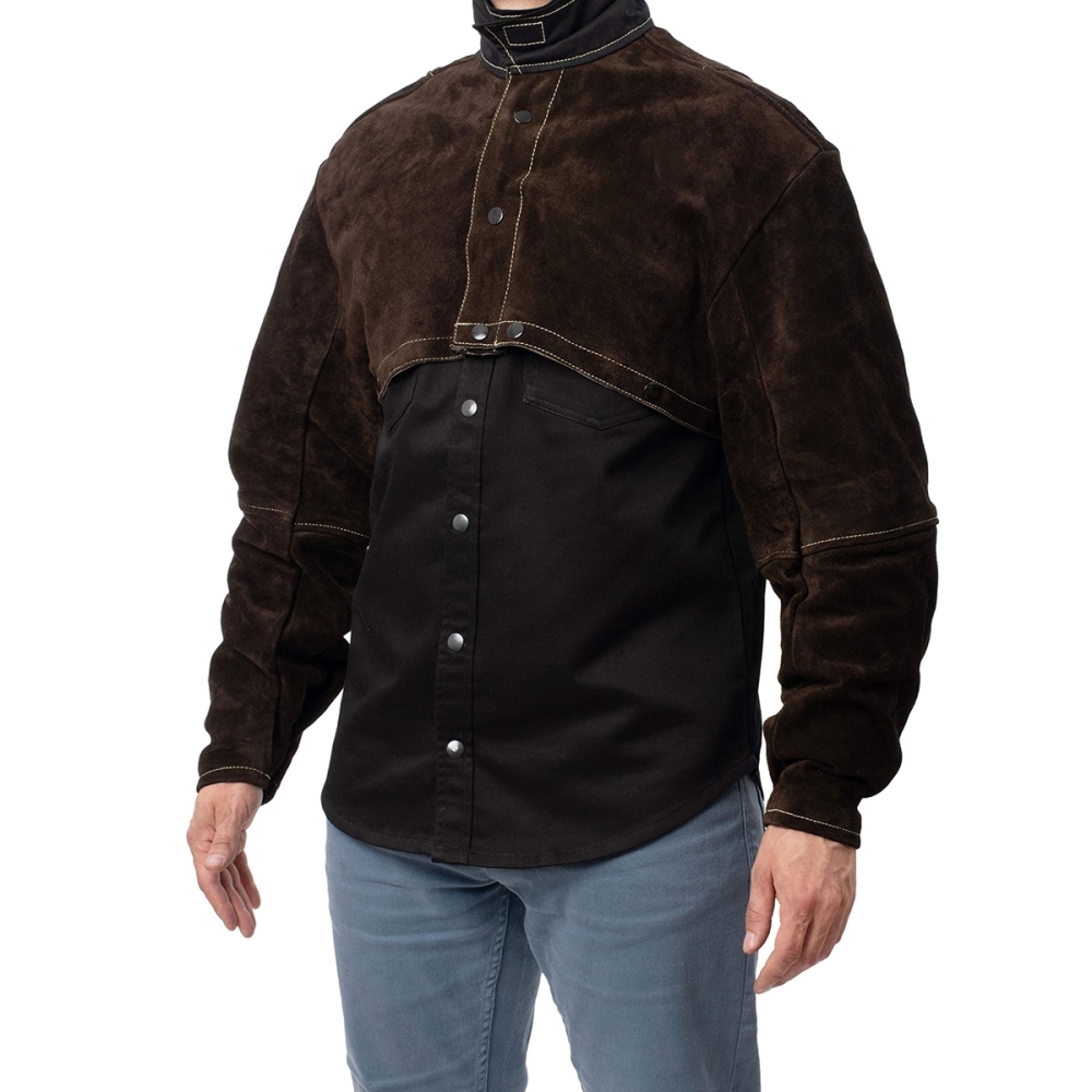 - Stand-up/roll-down leather collar snaps securely in place to protect neck.